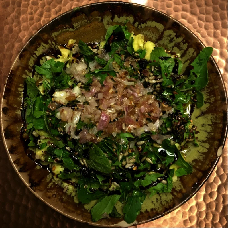 Avocado, arugula, sautéed Onions and roasted pumpkin seed,